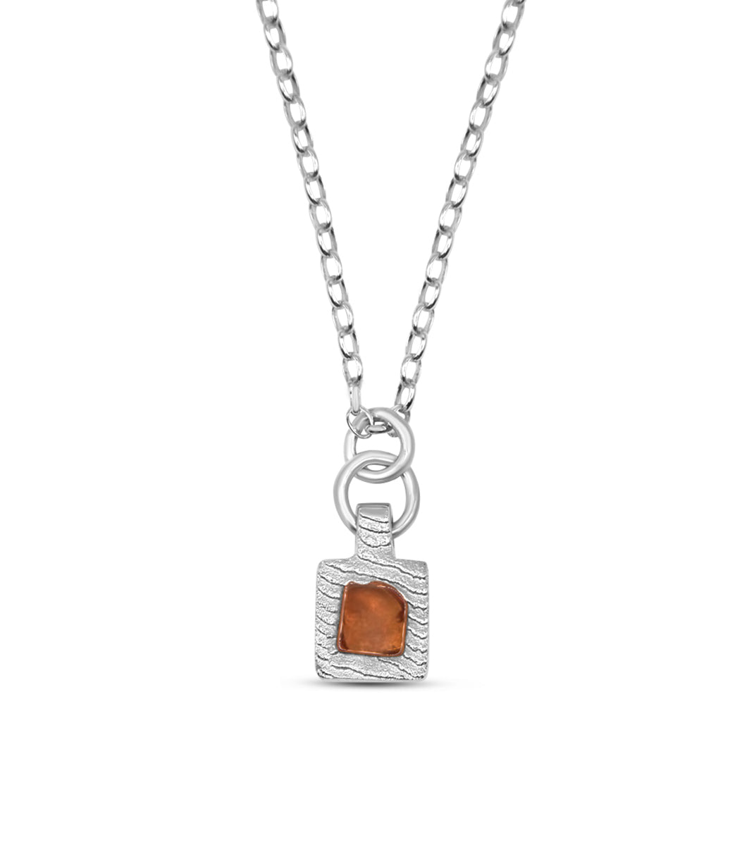 This necklace is one of a kind (1 of 1). Cuttlebone Cast square  pendant with flush cut Dark Orange Sapphire.  Hangs delicately from a 18" (45cm) Belcher Chain.
