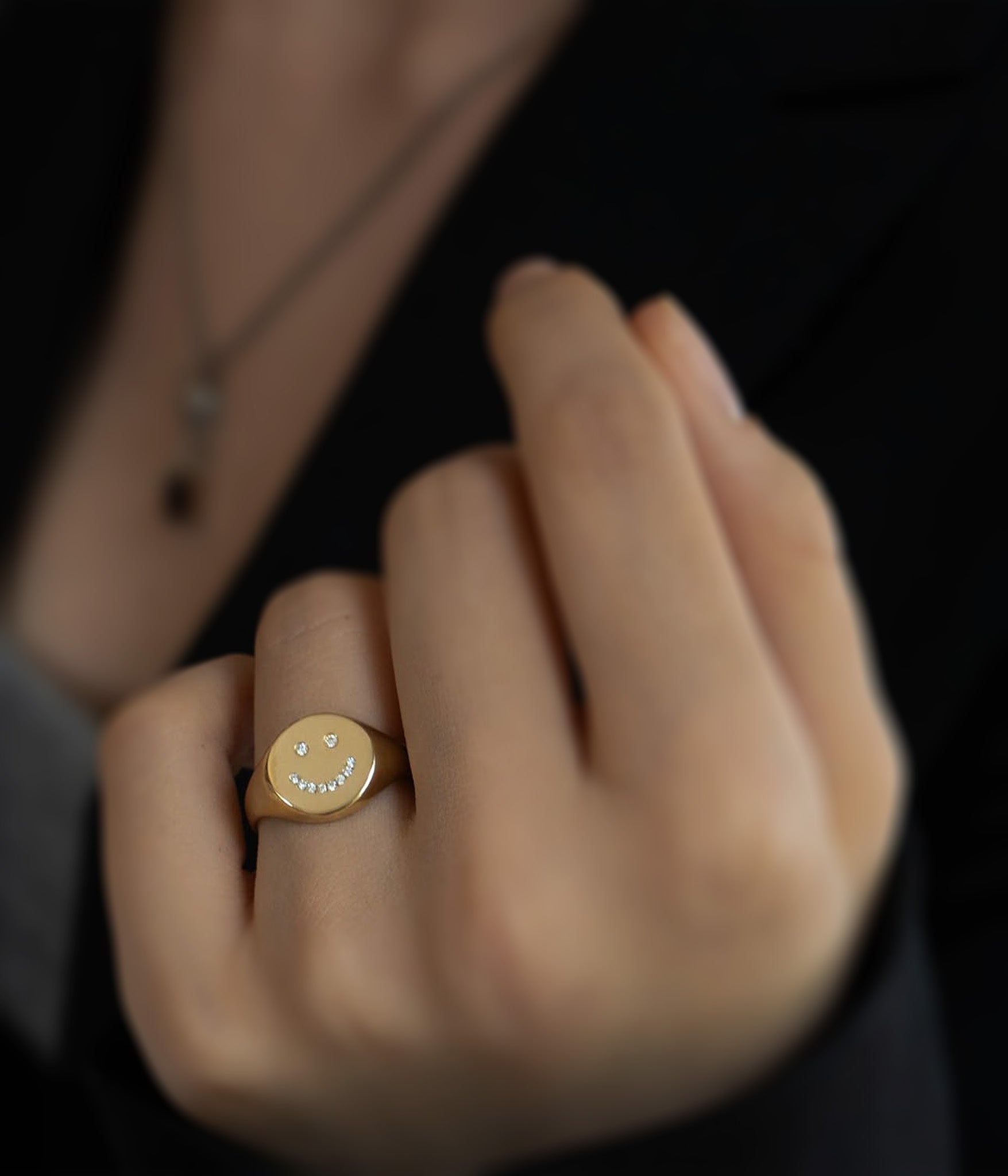 Model wearing 14k gold smiley face signet ring with diamond accents—handmade playful luxury jewelry
