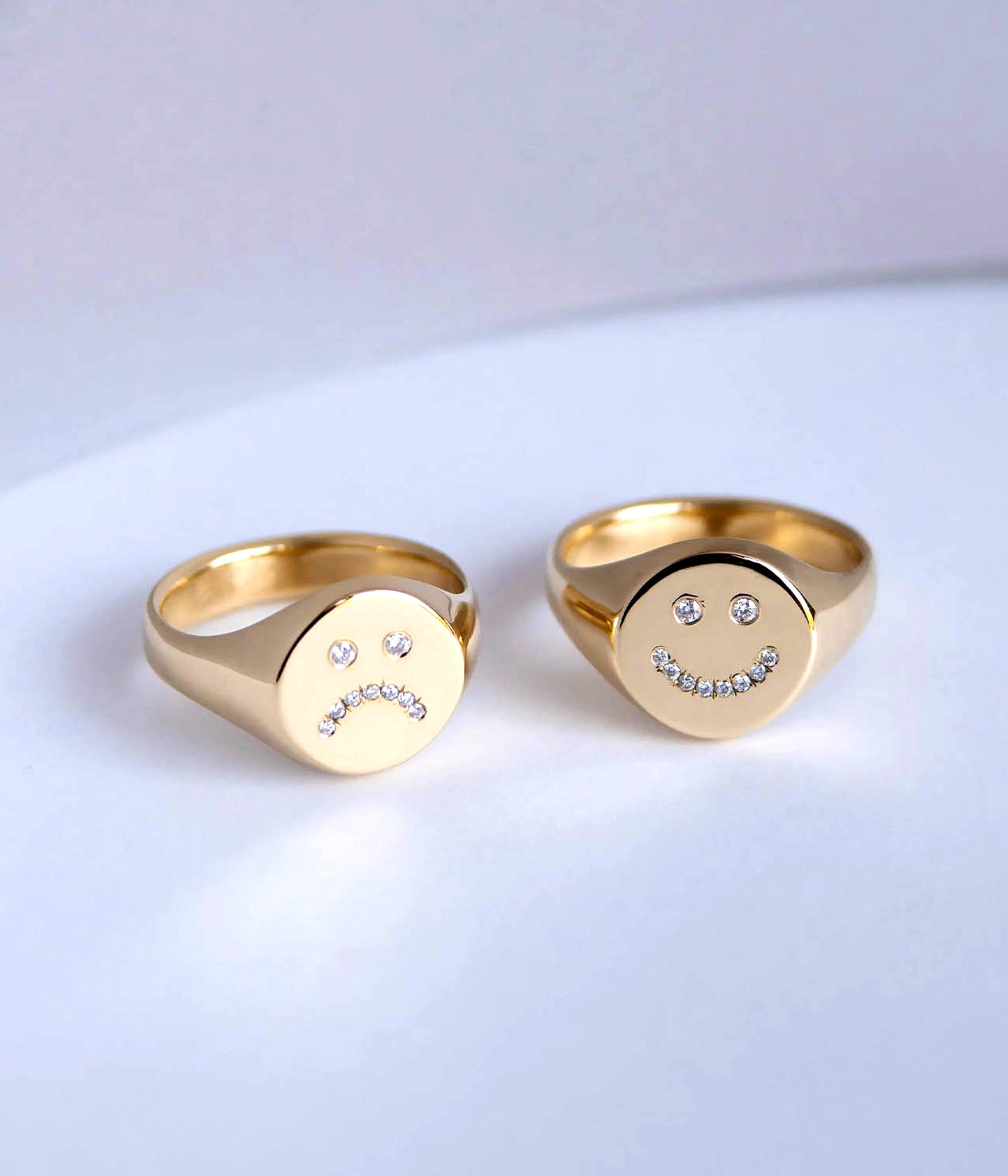Pair of 14k gold signet rings with smiley face and sad face designs, each with pavé diamond eyes and mouth—unisex emotional statement rings
