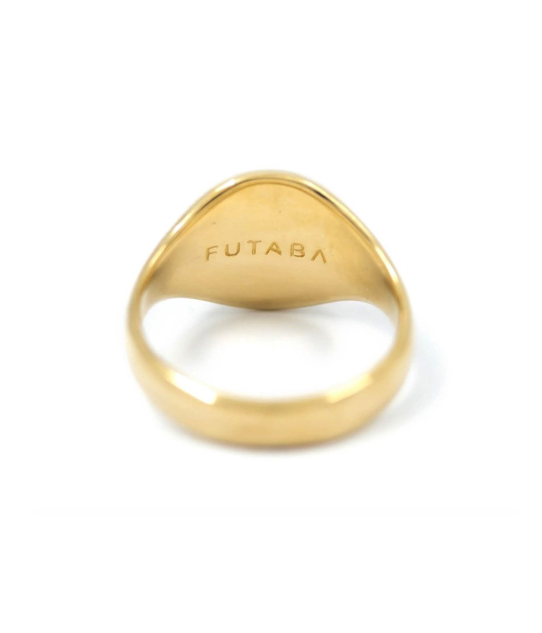 Inside engraving of 14k gold signet ring stamped with FUTABA brand name—handcrafted fine jewelry detail