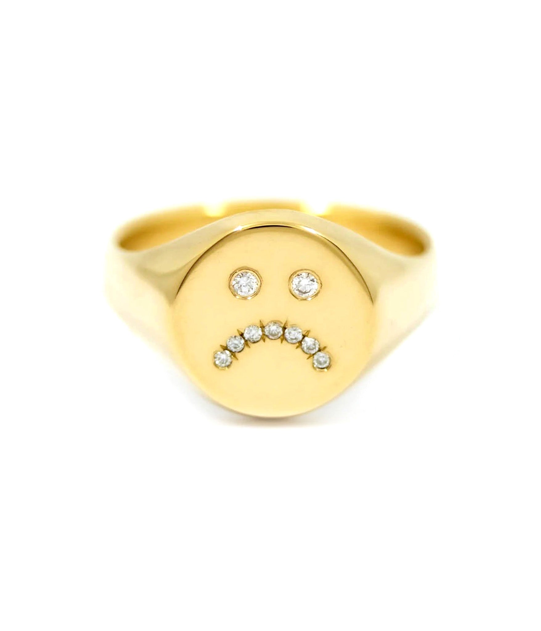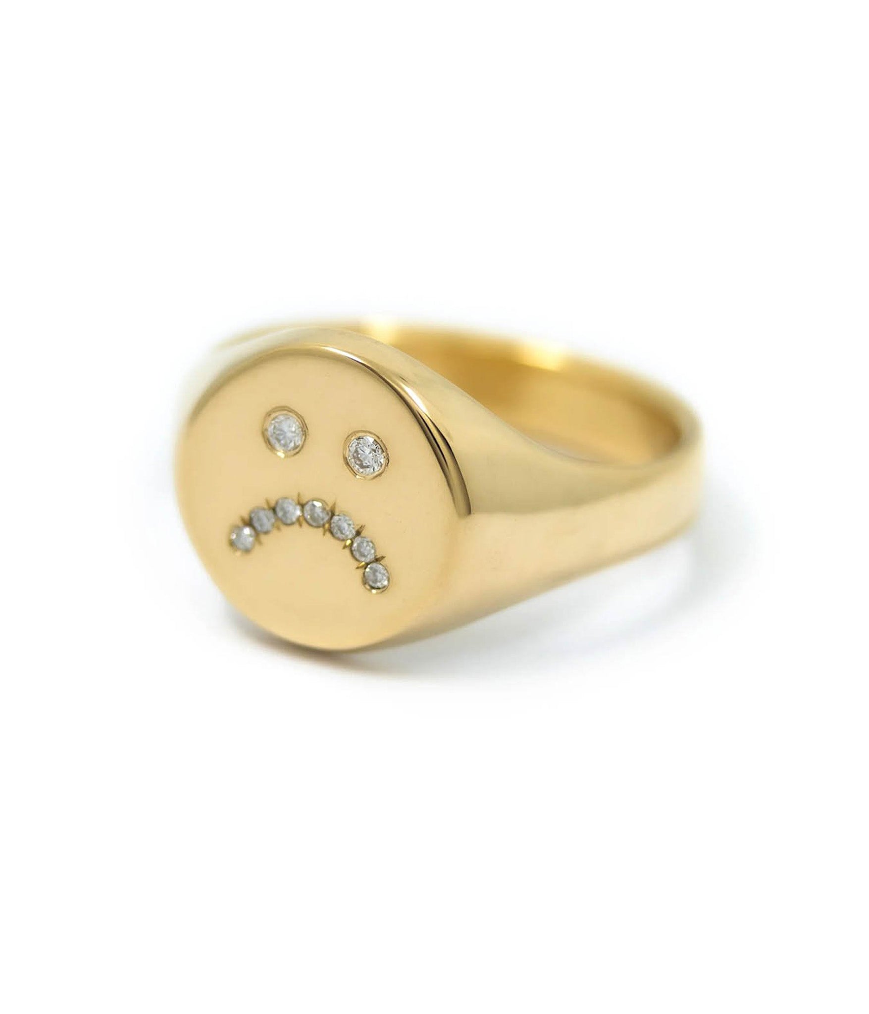 Close-up of 14k gold sad face signet ring with pavé diamonds forming frown and eyes—emotive luxury ring design