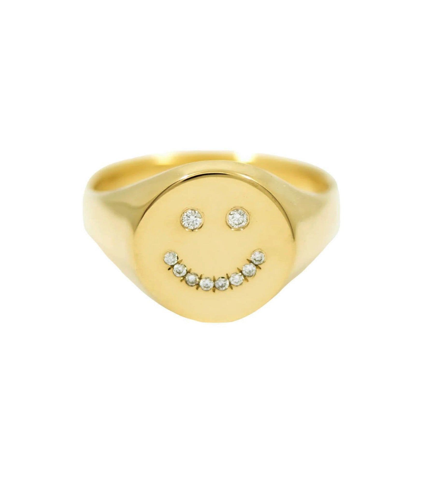 14k gold smiley face signet ring with pavé diamond eyes and curved diamond smile—minimalist happy face ring in polished gold