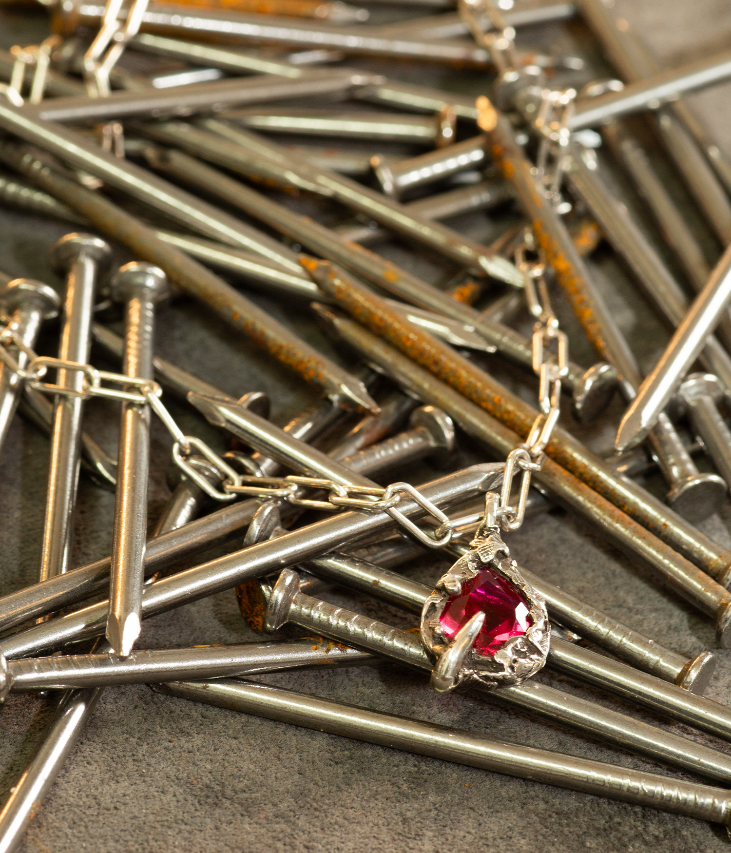 Necklace with a red gemstone pendant on a background of metal nails
