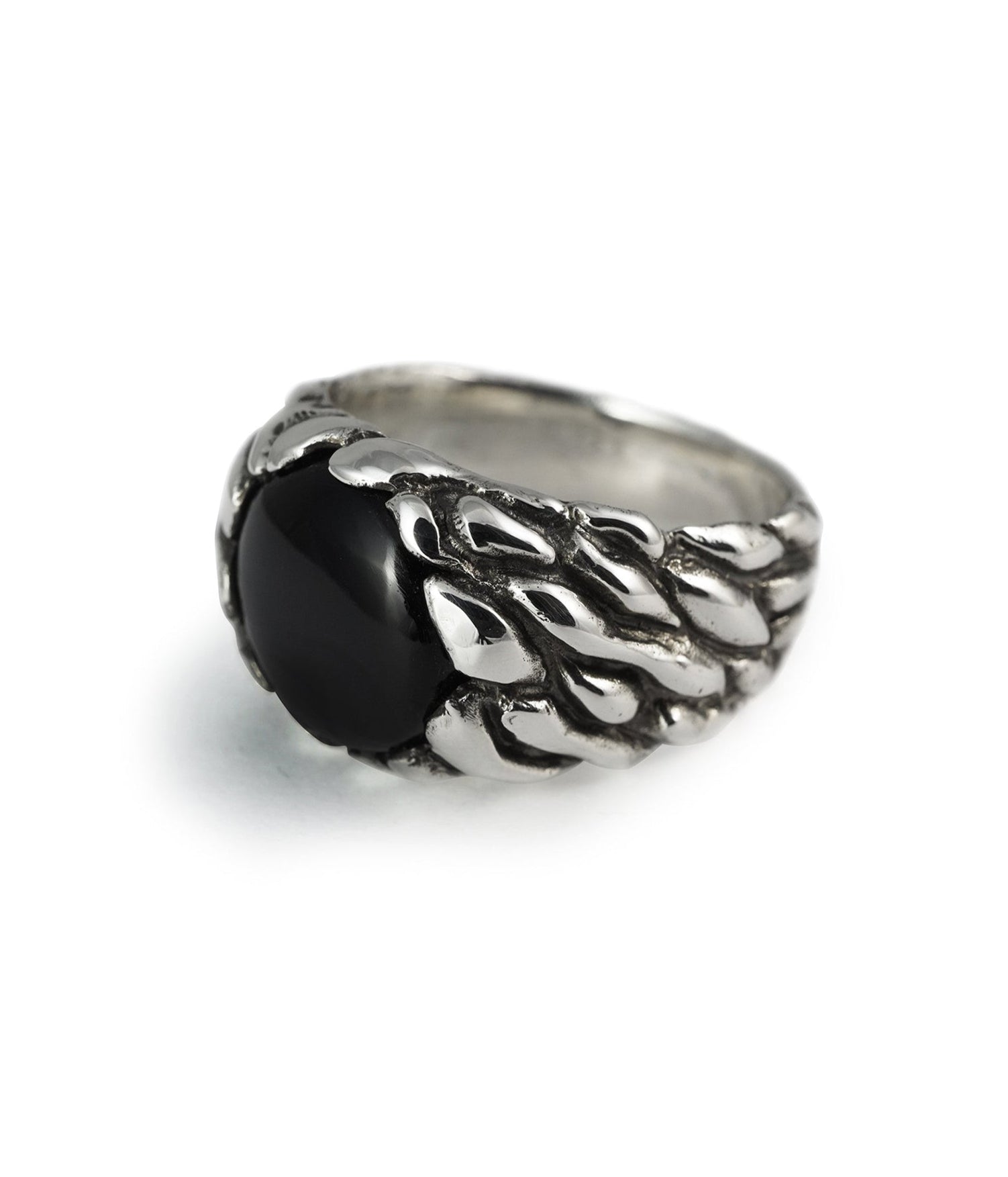 Textured band inspired by flowing water, wrapping around an Onyx centre.