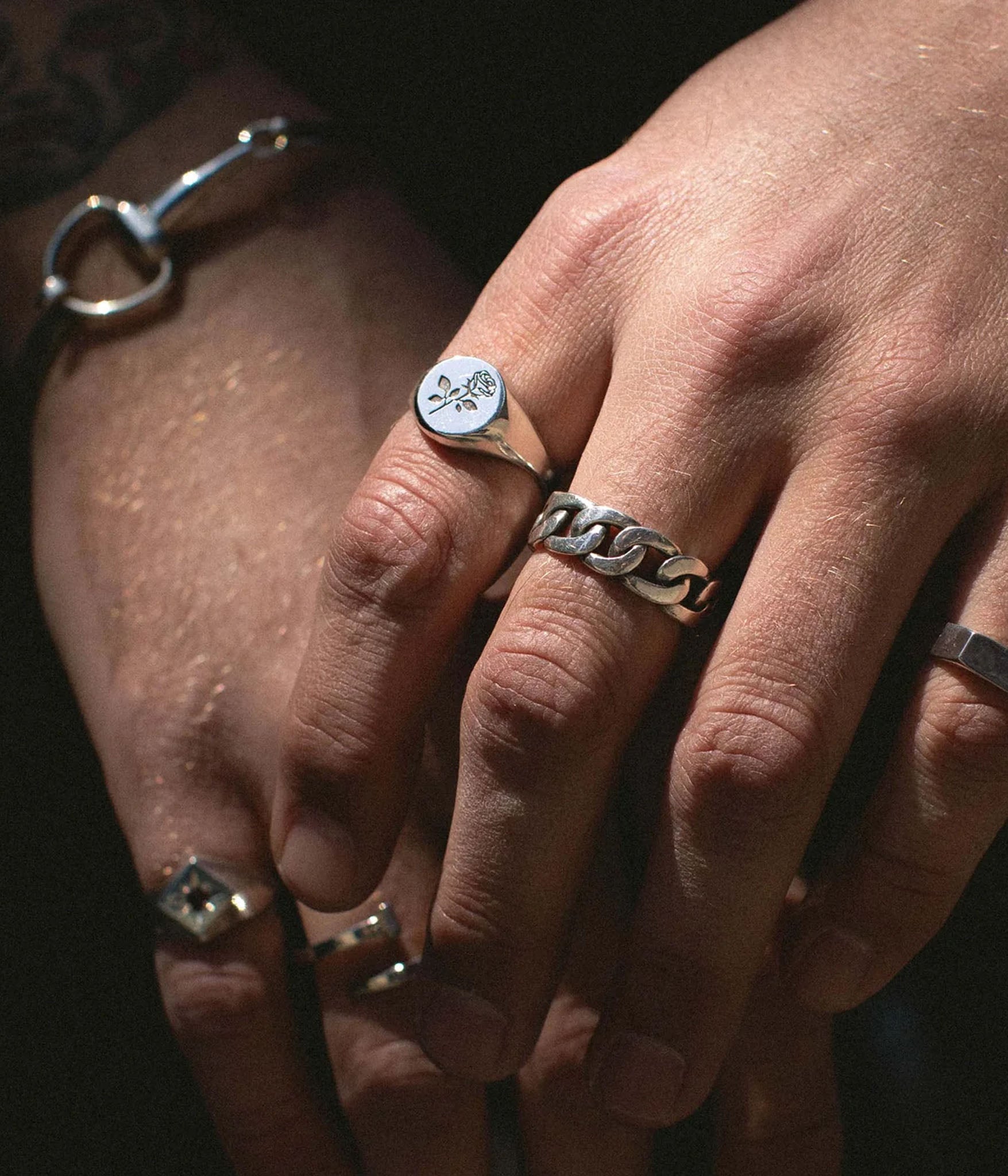Lightweight traditional round signet ring with timeless rose engraving. Oxidized detail and high polish finish.