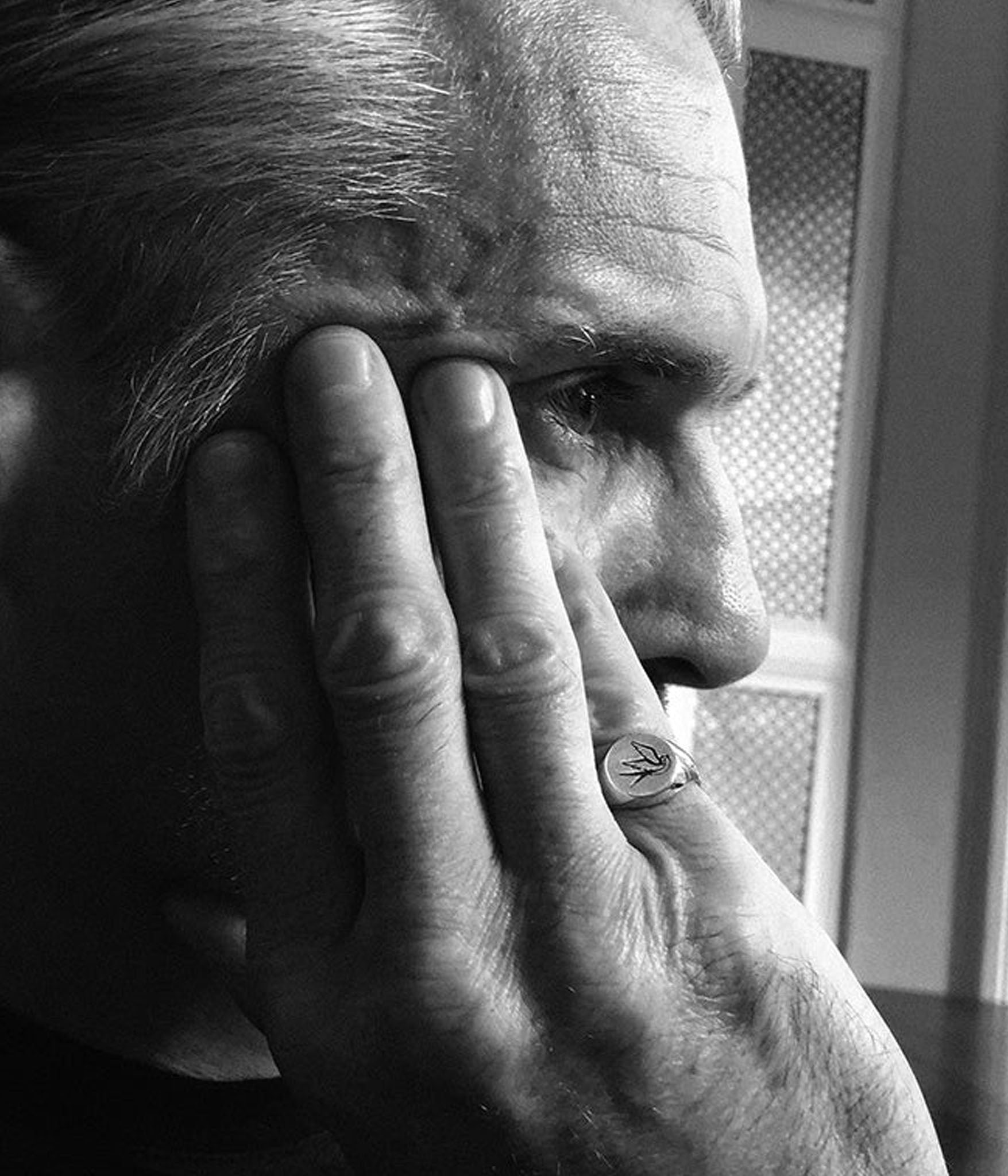 silver swallow signet worn on the pinky on male model in black and white