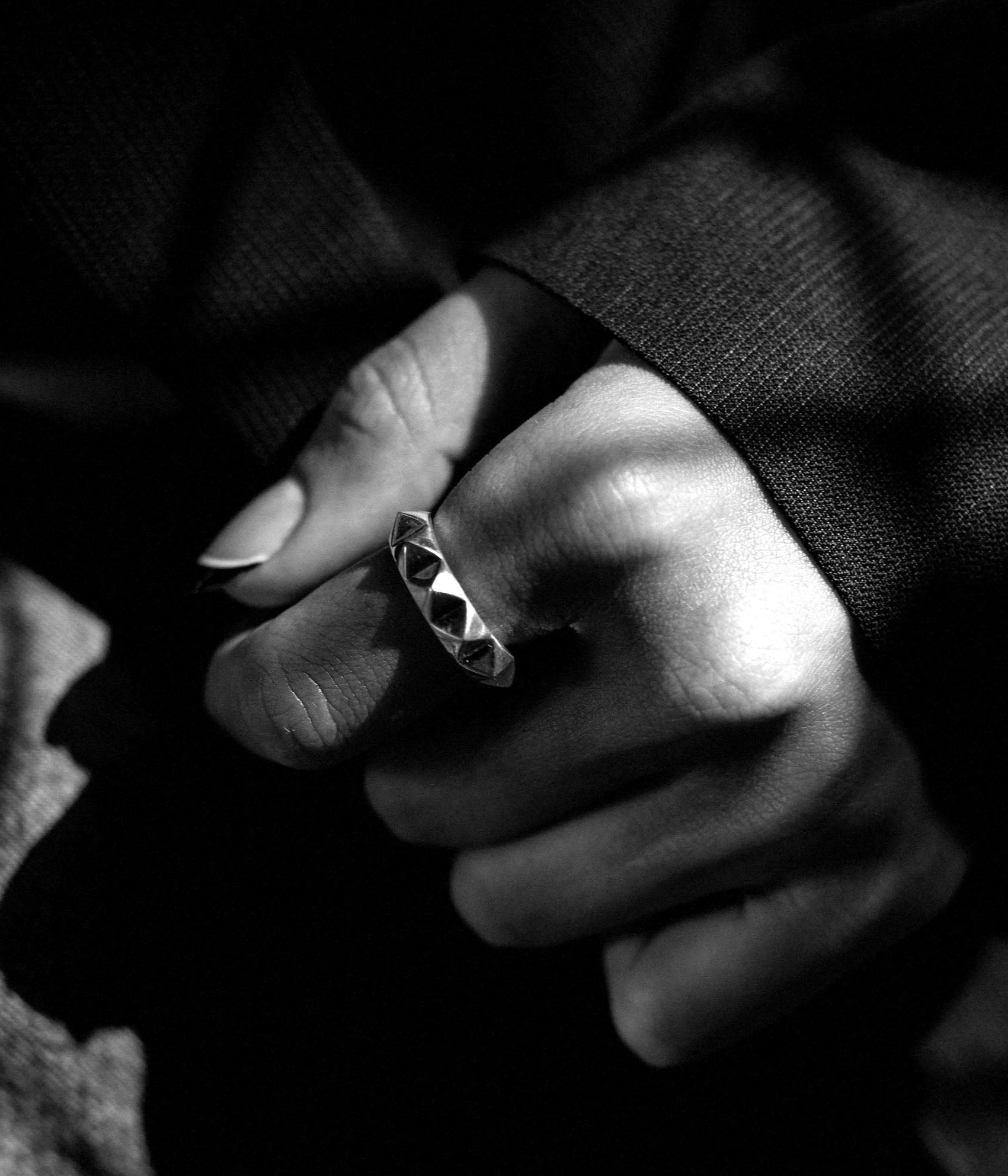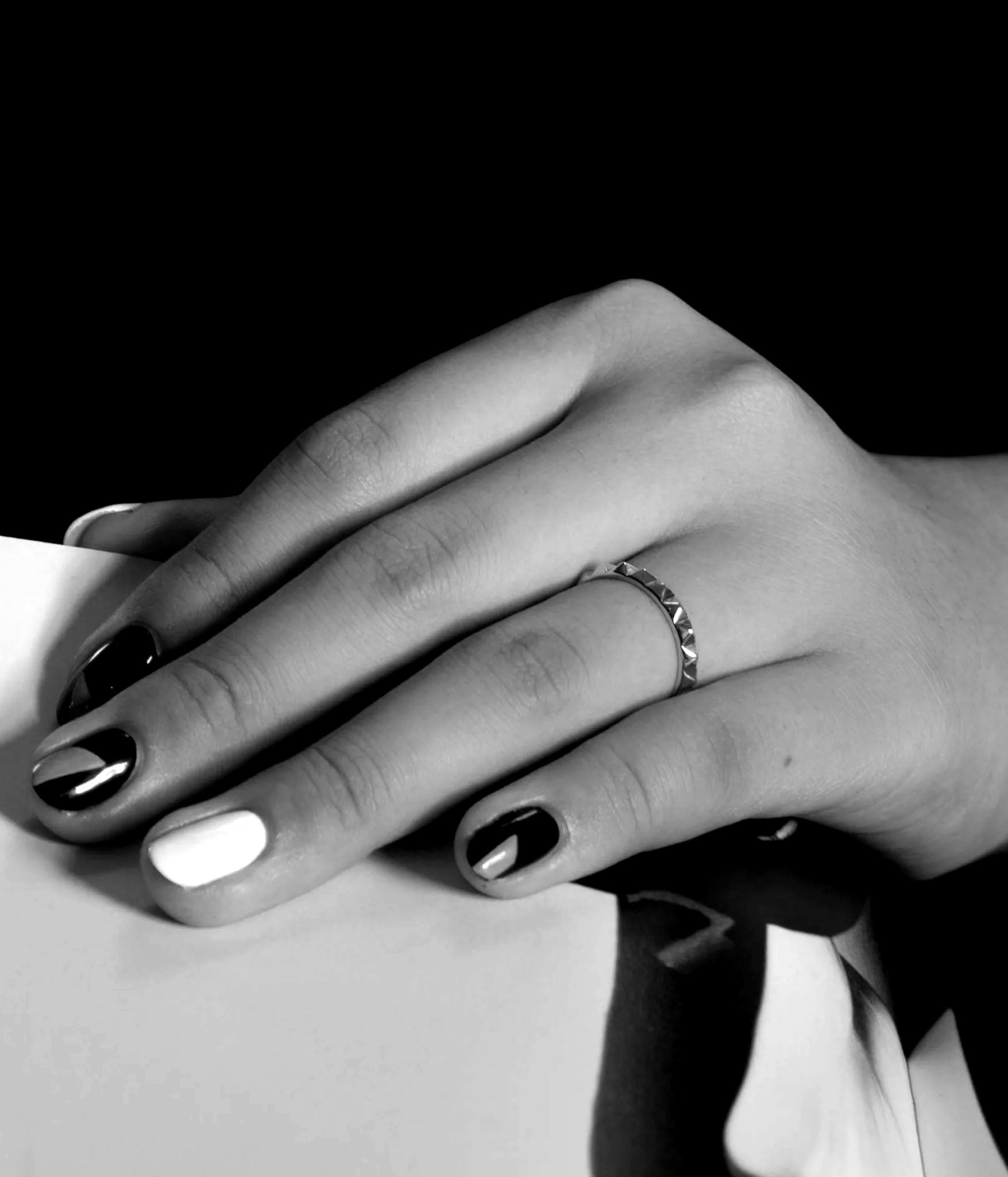 large sterling silver spike ring on models hand shot in harsh light in black and white photo