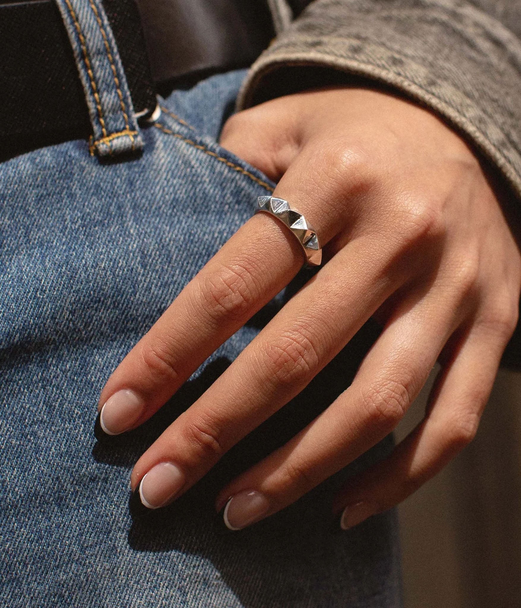 sterling silver spike ring on finger in editorial shot