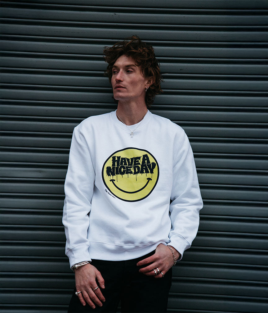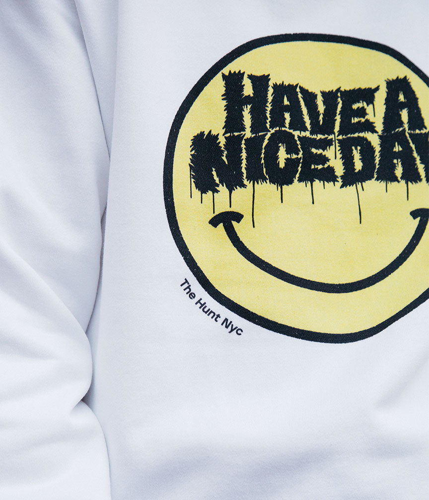 White sweatshirt with a yellow smiley face graphic and text 'Have a nice day' on a white background