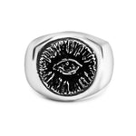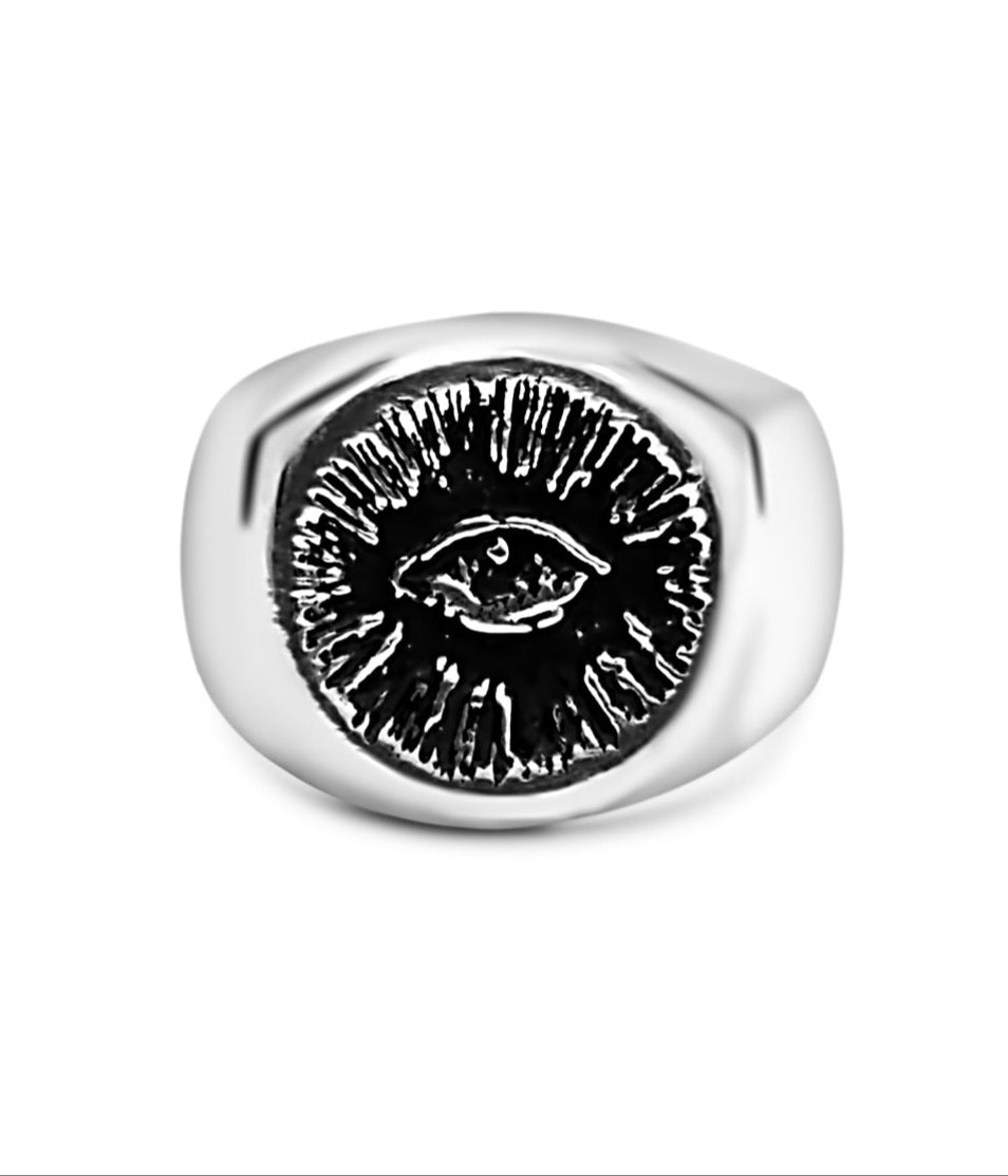 Close-up of a hand wearing multiple gold rings with eye designs.
